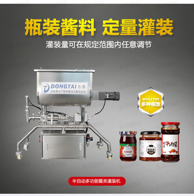 辣椒醬灌裝機 適合于將各類粘稠體及含有各種固體物質(zhì)如辣椒、花生、肉塊、佐料等物體的醬類和油、料分離的火鍋底料等灌裝于各種容器中,辣椒醬灌裝機 適用于辣椒醬、顆粒醬料、大塊肉醬、火鍋底料等的灌裝。辣椒醬灌裝機 /半自動辣椒醬灌裝機可灌裝顆粒漿狀流體物料,特別適用于調(diào)味品中帶顆粒并且濃度較大的辣椒醬、火鍋底料等粘稠醬類的灌裝,配置的自動攪拌器,辣椒醬灌裝機 保證了醬和油的充分混合,又稱為辣椒醬灌裝機、花生醬灌裝機、豆瓣醬灌裝機、果醬灌裝機,芝麻醬灌裝機、粘稠醬類灌裝機、牛肉醬灌裝機。