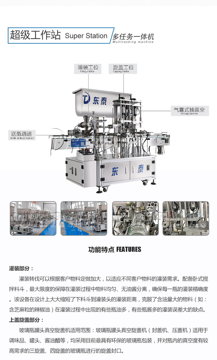 醬類灌裝旋蓋一體機采用活塞式伺服驅(qū)動原理,適用于調(diào)味品中的醬料,濃湯或者帶顆粒并且濃度較大的辣椒醬、豆瓣醬、花生醬、芝麻醬、果醬、濃醬、蜂蜜等較為粘稠醬類的灌裝,自動化程度高,機器能完成自動灌裝、自動取蓋上蓋,自動真空封蓋封口。