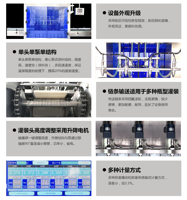 8、每個(gè)灌裝頭均有稱重和反饋系統(tǒng),可對(duì)每個(gè)頭的灌裝量進(jìn)行設(shè)置和微量調(diào)整。