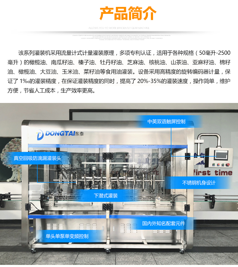 這款食用油灌裝機(jī)應(yīng)用的是流量計(jì)式計(jì)量灌裝的原理,榮獲了多項(xiàng)認(rèn)證資格,可適用各種容量(1-5升)的南瓜籽油、榛子油、牡丹籽油、芝麻油、核桃油、山茶油、亞麻籽油、棉籽油、橄欖油、大豆油、玉米油、菜籽油等多種食用油的灌裝。這個(gè)食用油選用了高精的旋轉(zhuǎn)編碼器計(jì)量,使灌裝精度保持在了1%o,在保證樂灌裝誤差的同時(shí),提高了20%-35%的灌裝速率,使用方便,維護(hù)便捷,減少了一部分的人工成本,使生產(chǎn)效率提升。除了進(jìn)桶時(shí)間,6頭灌裝機(jī),變頻器在25赫茲的速率進(jìn)行下,每組灌裝的時(shí)間為16秒,1350桶/小時(shí);