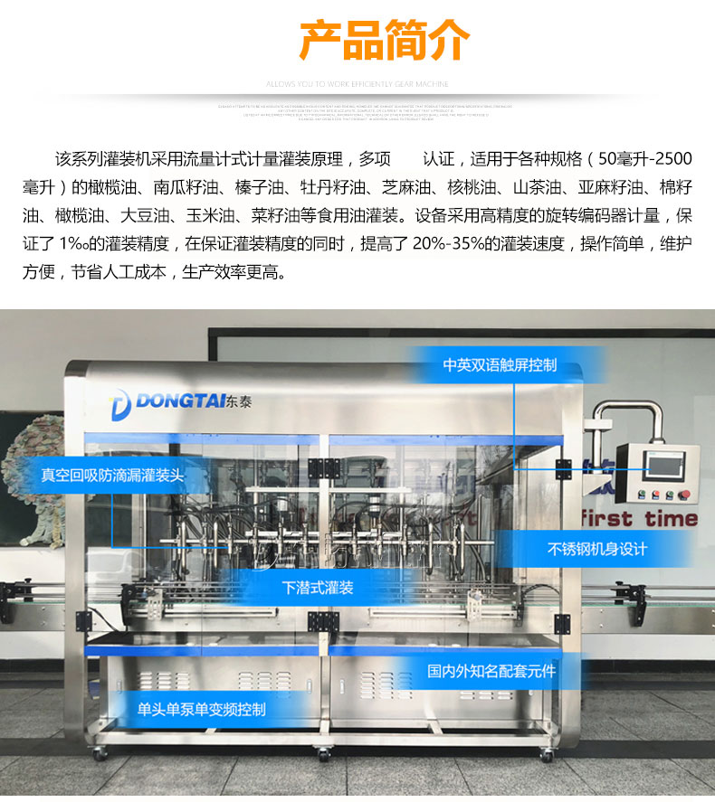 該食用油灌裝機(jī)采用流量計式計量灌裝原理,多項認(rèn)證,適用于各種規(guī)格(1-5升)的南瓜籽油、榛子油、牡丹籽油、芝麻油、核桃油、山茶油、亞麻籽油、棉籽油、橄欖油、大豆油、玉米油、菜籽油等食用油灌裝。設(shè)備采用高精的旋轉(zhuǎn)編碼器計量,保證了1%o的灌裝精度,在保證灌裝精度的同時,提高了20%-35%的灌裝速度,操作簡單,維護(hù)方便,節(jié)省人工成本,生產(chǎn)效率更高。